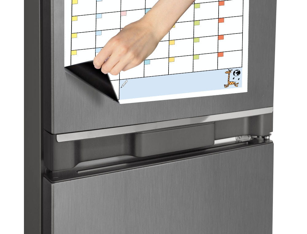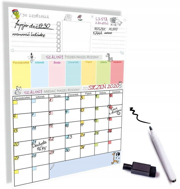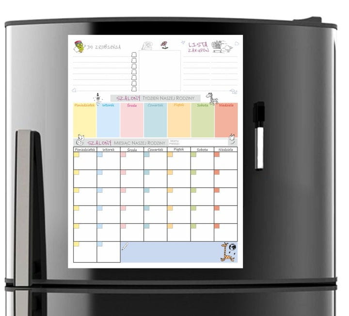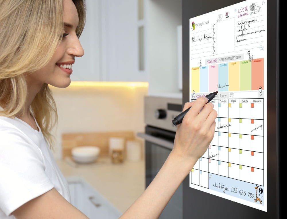 Kalendarz magnetyczny na lodówkę z czarnym pisakiem.