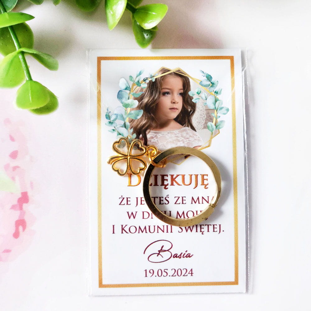 Podziękowanie dla gości składa się z personalizowanej karteczki i dowolnego breloczka np. koniczynki, słonika lub krzyżyka.