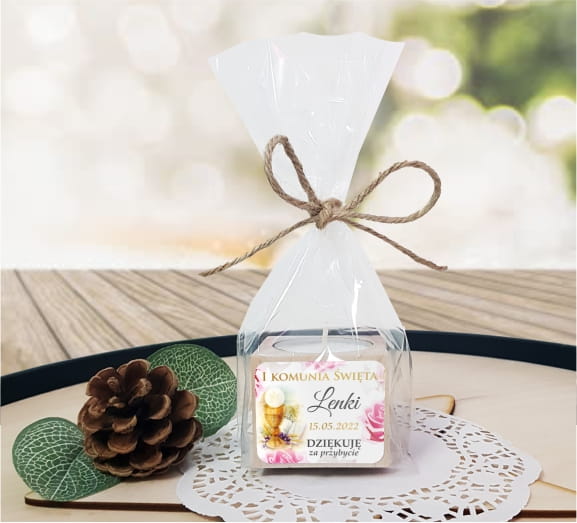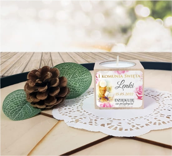 Drewniany świecznik z naklejką, Świeczka, Komunia, Podziękowanie dla gości, LAM_1022