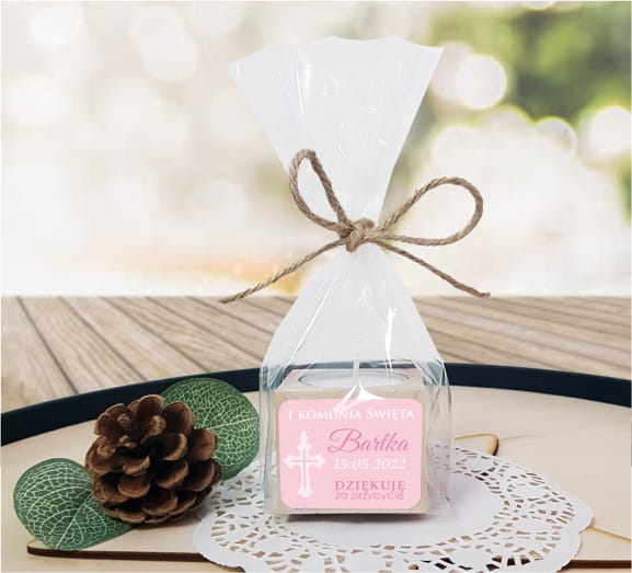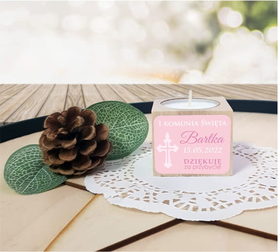 Drewniany świecznik z naklejką, Świeczka, Komunia, Podziękowanie dla gości, LAM_1023