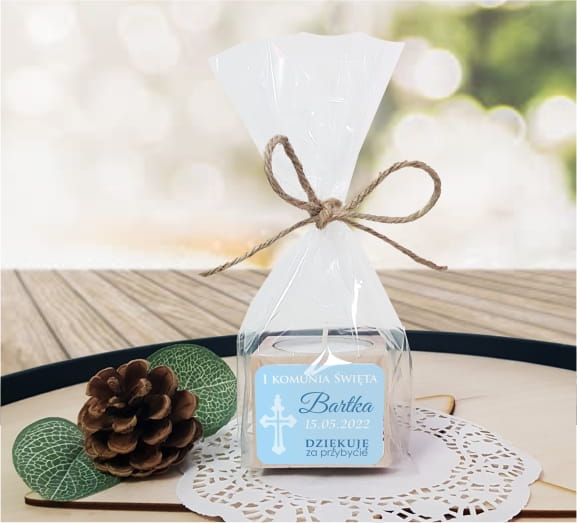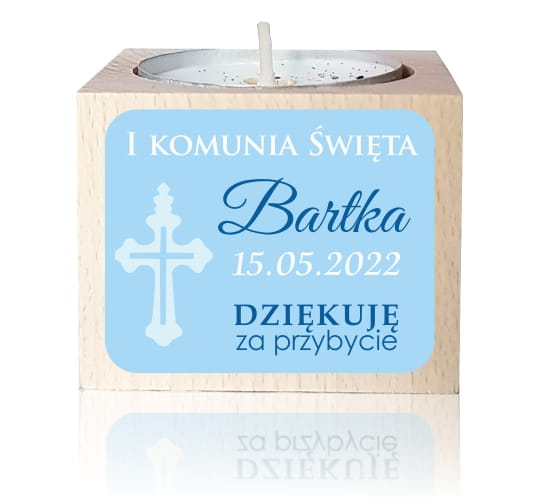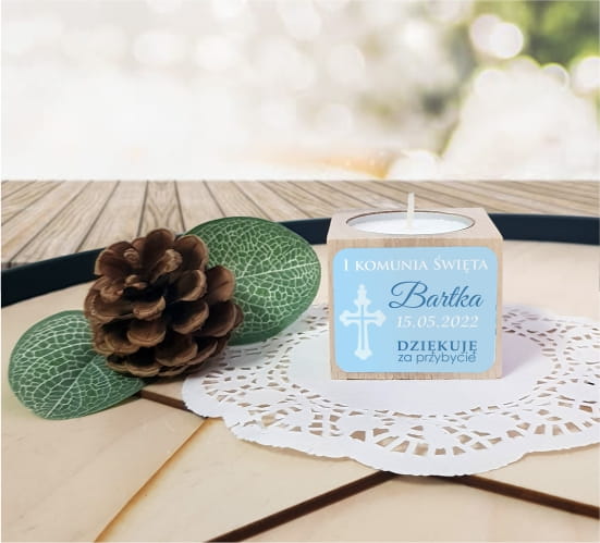 Drewniany świecznik z naklejką, Świeczka, Komunia, Podziękowanie dla gości, LAM_1024