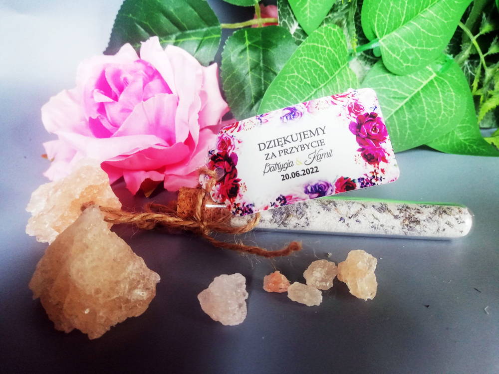 Oprócz probówki z solą do kąpieli w zestawie znajduje się personalizowana zawieszka oraz sznureczek jutowy do samodzielnego zawiązania.