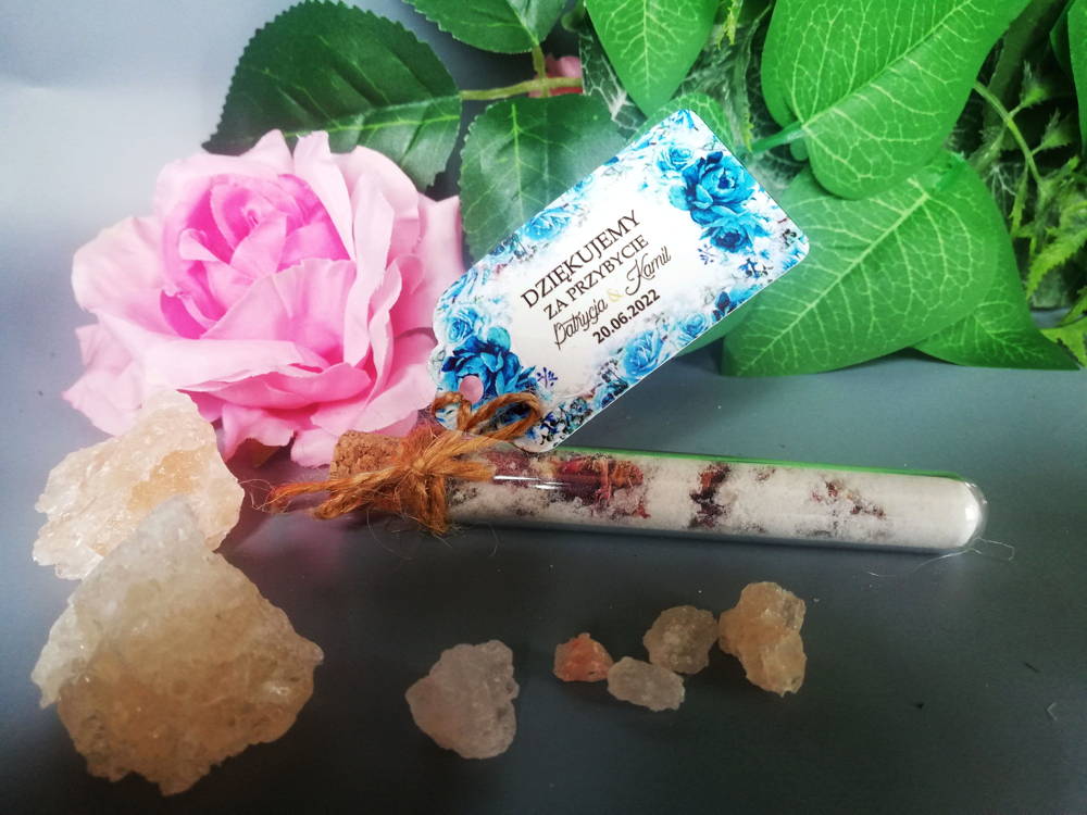 Oprócz probówki z solą do kąpieli w zestawie znajduje się personalizowana zawieszka oraz sznureczek jutowy do samodzielnego zawiązania.