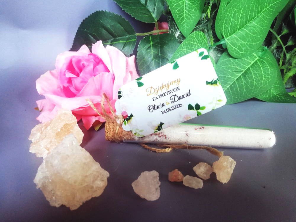 Oprócz probówki z solą do kąpieli w zestawie znajduje się personalizowana zawieszka oraz sznureczek jutowy do samodzielnego zawiązania.