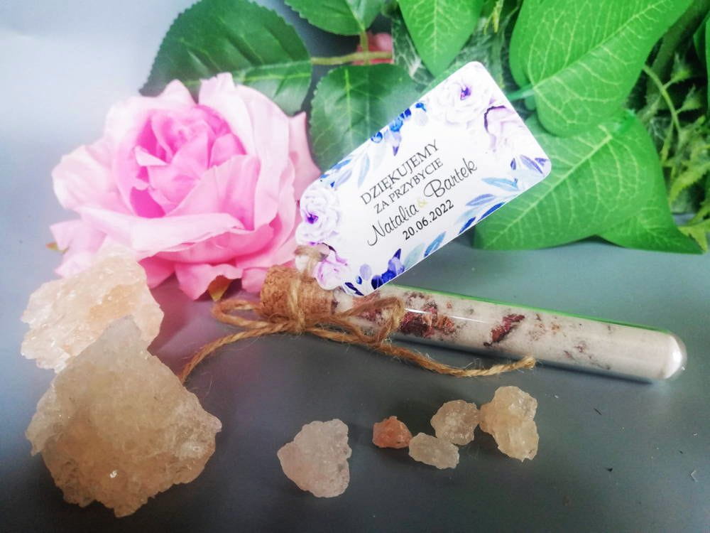 Oprócz probówki z solą do kąpieli w zestawie znajduje się personalizowana zawieszka oraz sznureczek jutowy do samodzielnego zawiązania.