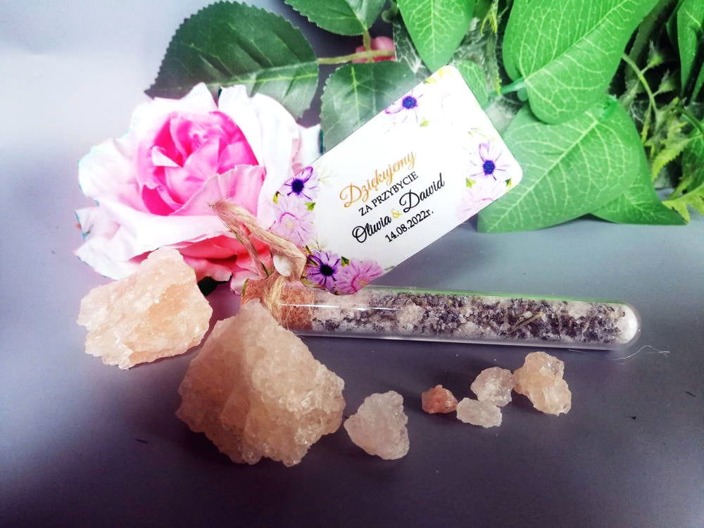 Oprócz probówki z solą do kąpieli w zestawie znajduje się personalizowana zawieszka oraz sznureczek jutowy do samodzielnego zawiązania.