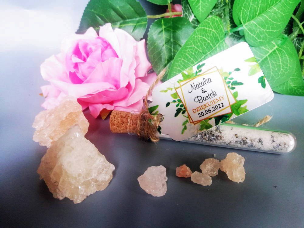 Fiolki weselne, wypełnione solą do kąpieli to estetyczny podarunek dla gości oraz oryginalne podziękowanie za przybycie. Taki upominek sprawi Waszym gościom wiele radości oraz relaksu. Sole nadają się do odprężającej kąpieli, uspokajają a także pozytywnie działają na stan i kondycję skóry.