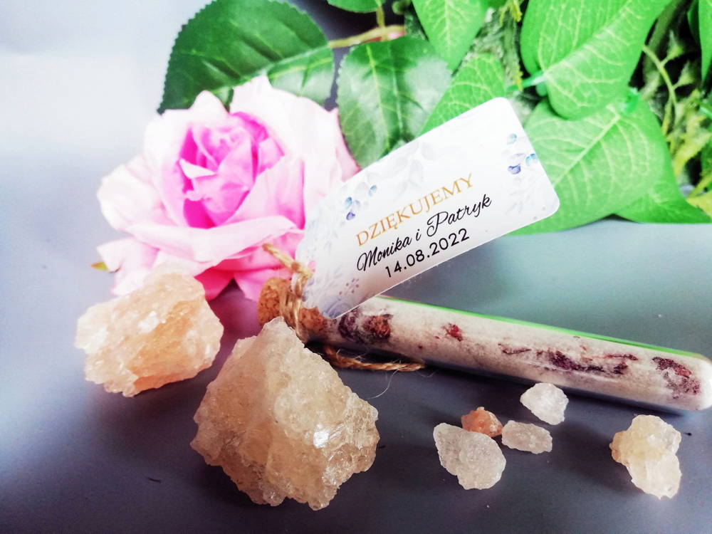 Oprócz probówki z solą do kąpieli w zestawie znajduje się personalizowana zawieszka oraz sznureczek jutowy do samodzielnego zawiązania.