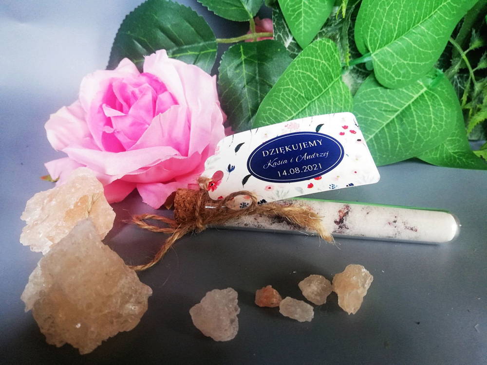 Oprócz probówki z solą do kąpieli w zestawie znajduje się personalizowana zawieszka oraz sznureczek jutowy do samodzielnego zawiązania.