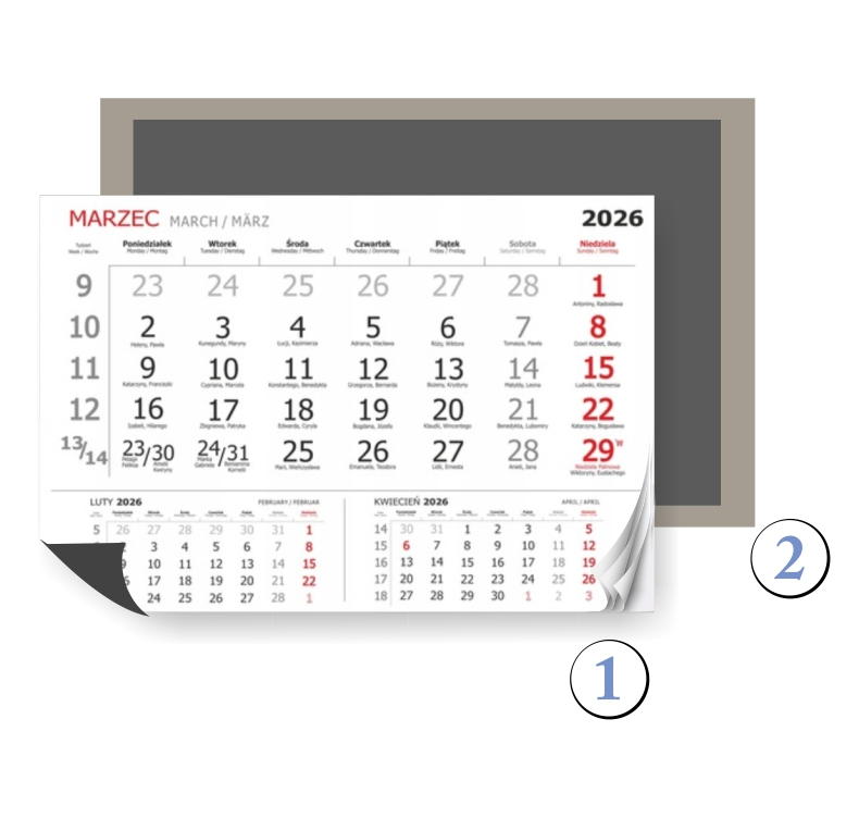 3 kolory druku - czarny, czerwony i szary: niedziele i dni świąteczne w kolorze czerwonym, sobota w kolorze szarym