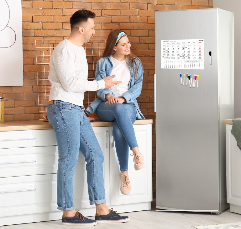 Folia magnetyczna dzięki której cały kalendarz bez problemu trzyma się na lodówce lub innej metalowej powierzchni.