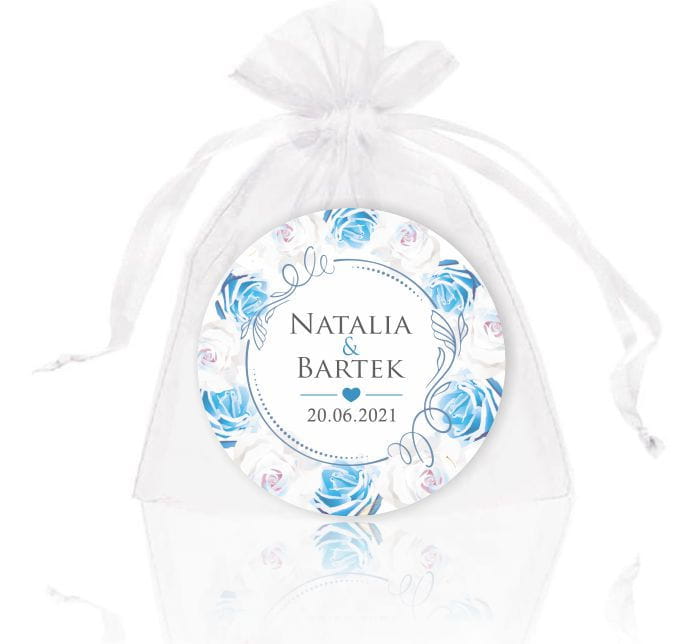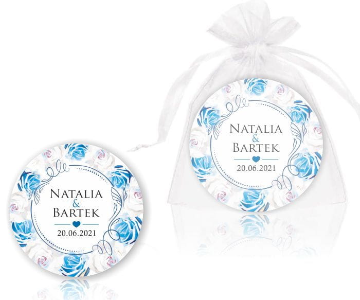 Młoda Para, Magnesy na lodówkę, Podziękowania dla gości, białe i niebieski róże, kwiaty.