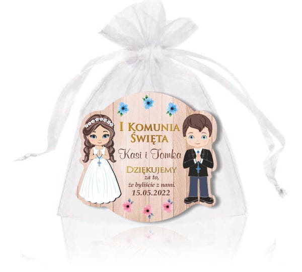 Magnes na lodówkę świetnie sprawdzi się jako podziękowanie dla gości z okazji Pierwszej Komunii Świętej. To praktyczny upominek, który z pewnością nie trafi do kosza. Magnesy podziękowania na komunię są spersonalizowane czyli mają nadrukowane imię dziecka oraz datę Komunii Św. W naszej ofercie mamy wiele magnesów na komunię, także dla bliźniaków i bliźniaczek.