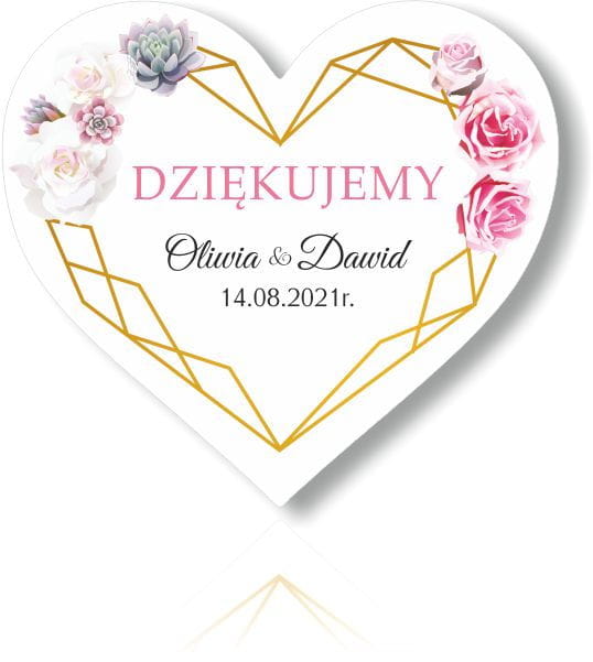 Magnesy w kształcie serca dla gości weselnych, sukulenty i róże ze złotą ramką