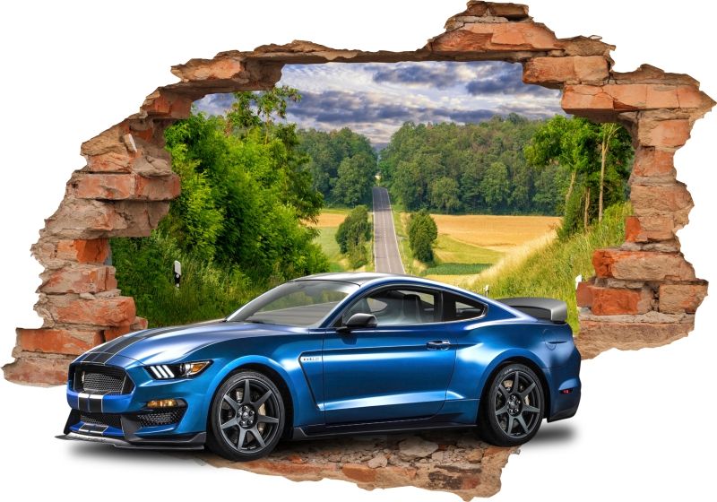 Naklejki ścienne 3D "Niebieski Ford Mustang, zielona droga, las"