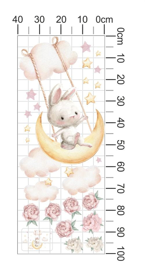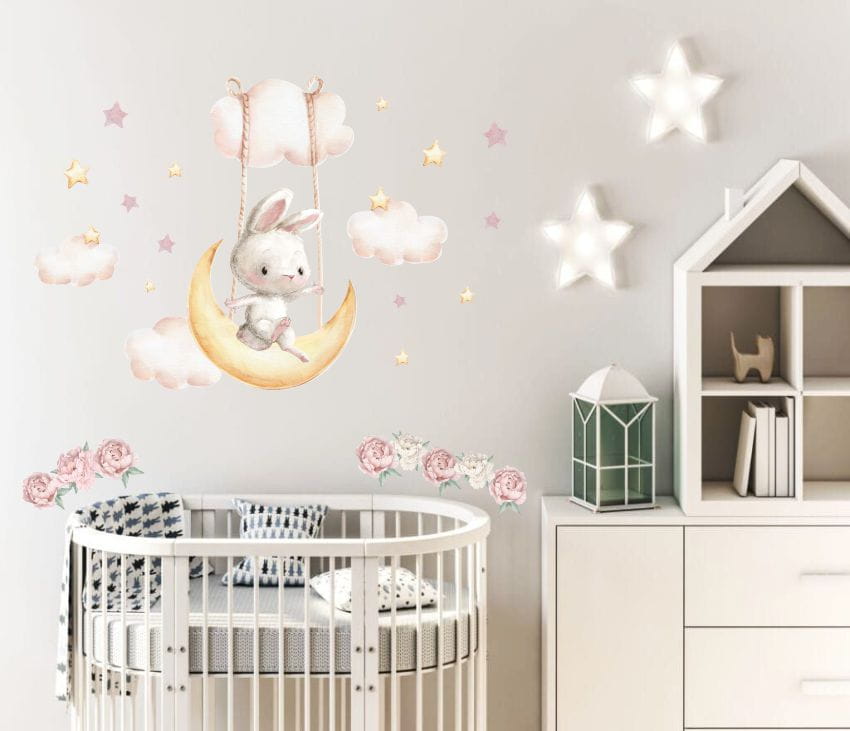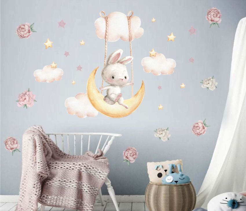 Naklejki do pokoju małego dziecka, szary króliczek bujający się na księżycu.