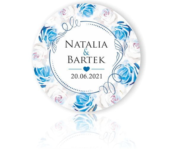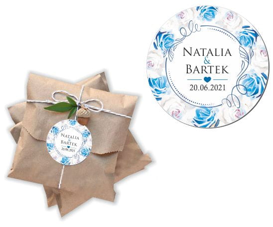 Naklejki personalizowne 50 szt. 4x4cm, Białe i niebieskie róże, Podziękowania dla gości, NAK520
