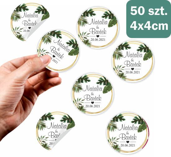 Naklejki personalizowne 50 szt. 4x4cm, Turkusowy magnes, Zielone liście, Podziękowania dla gości, NAK524