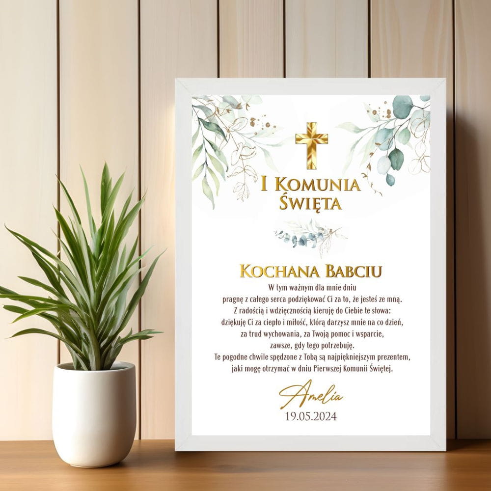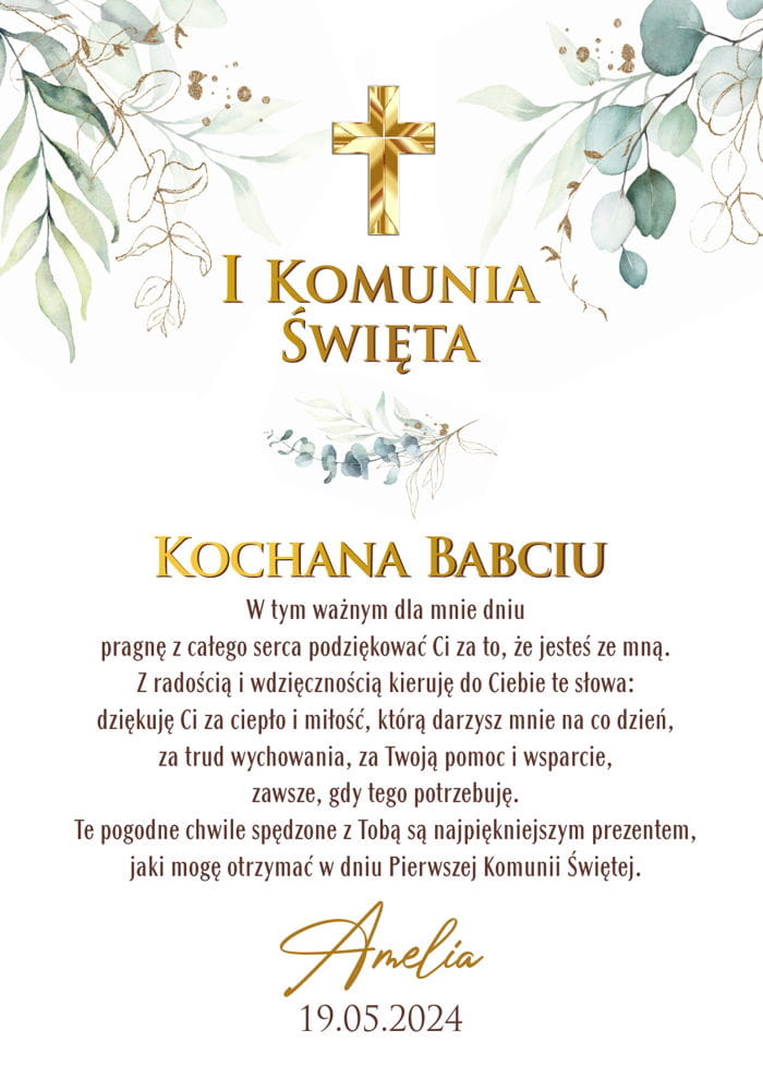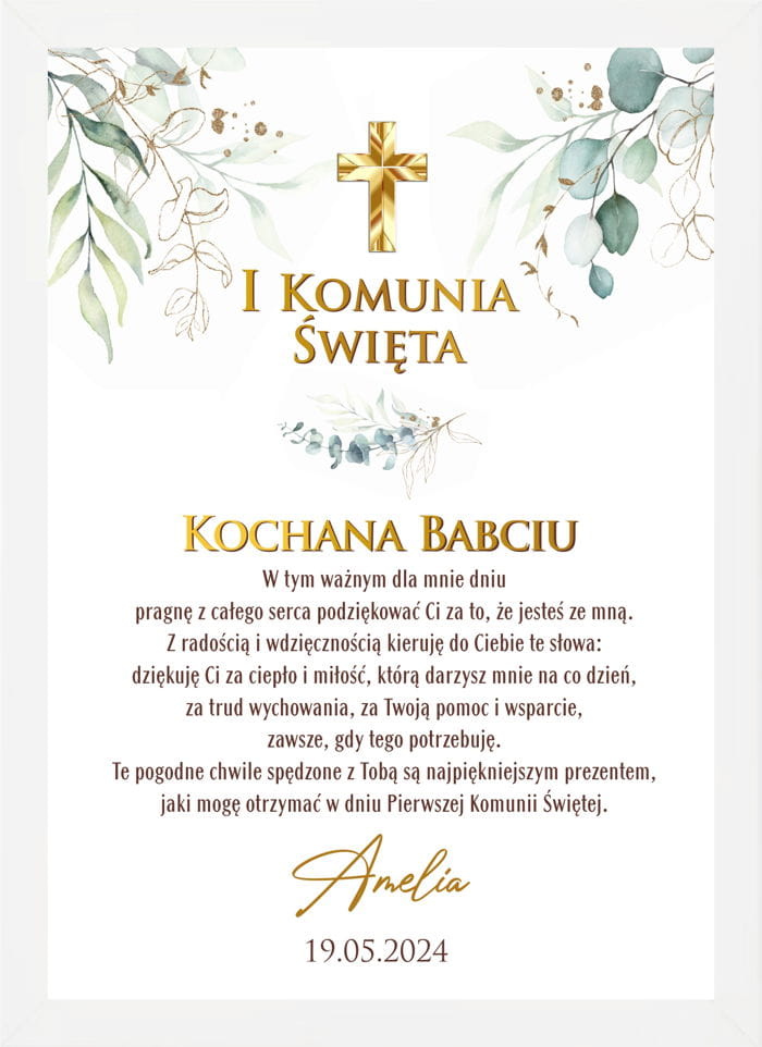 Obraz podziękowanie dla Babci z okazji Pierwszej Komunii Świętej od wnusi z krzyżykiem i eukaliptusem