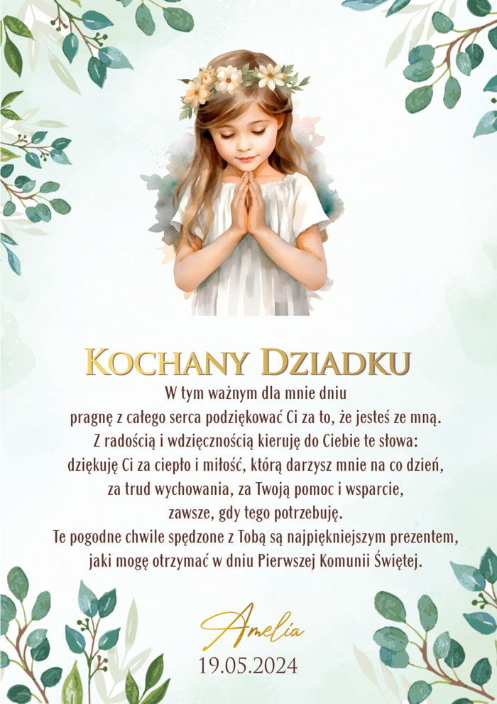 Obraz podziękowanie dla Dziadka okazji Pierwszej Komunii Świętej od prawnuczki