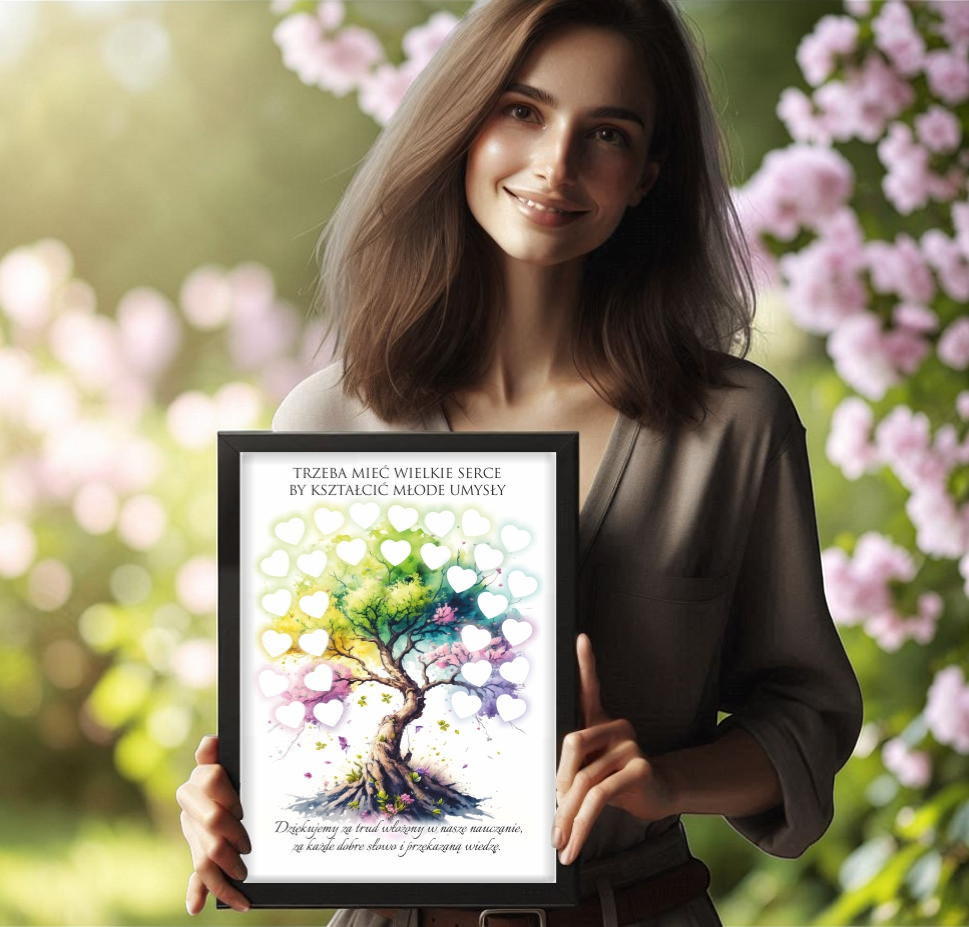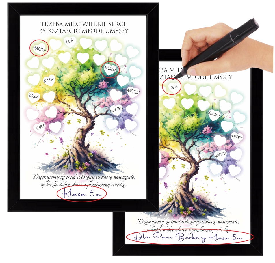 Jeżeli szukacie oryginalnego pomysłu na podziękowanie od całej klasy lub grupy to szczególnie polecamy naszą ramkę z piękną grafiką drzewa i pustymi serduszkami do podpisania się przez uczniów.