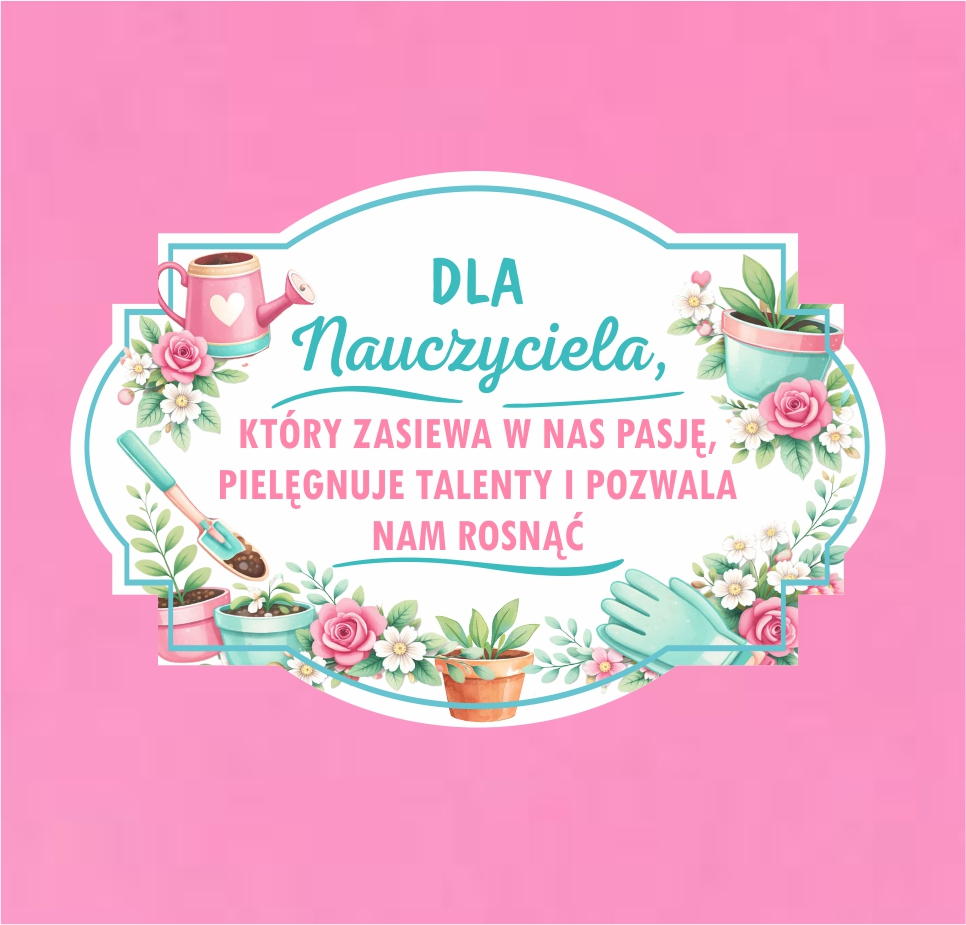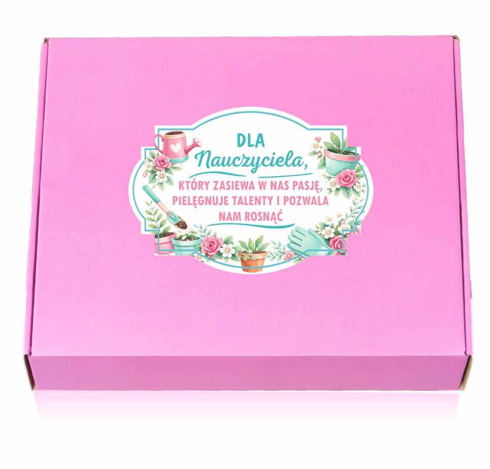 ✅ Naklejka na wieczku z napisem: „Dla Nauczyciela, który zasiewa w nas pasję, pielęgnuje talenty i pozwala nam rosnąć.”