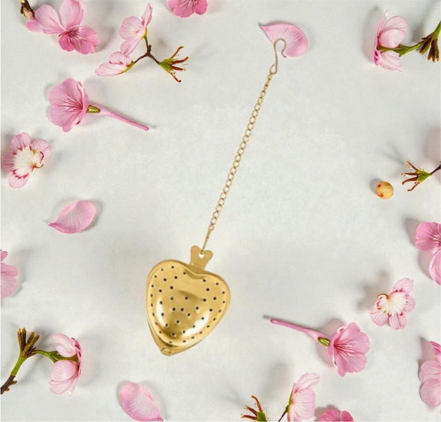 ✅ złota truskawka – wyjątkowy zaparzacz na łańcuszku wykonany ze stali nierdzewnej. Biżuteryjny detal, który zamieni parzenie herbaty w rytuał.