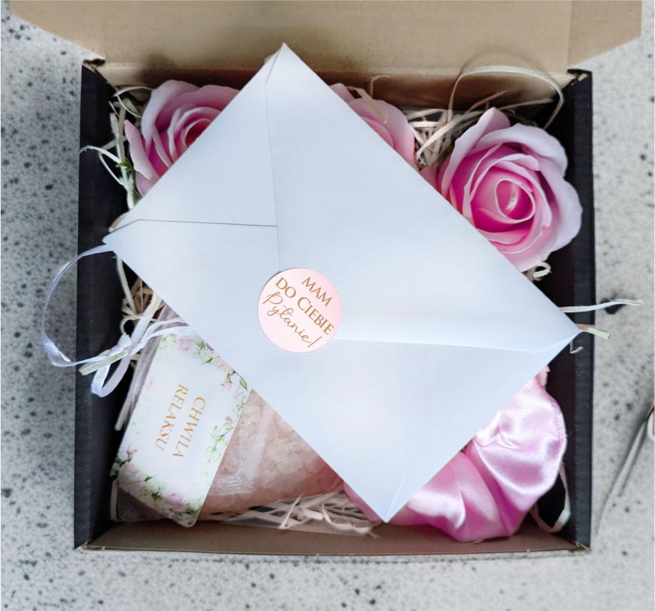 W środku umieszczona jest koperta z karteczką z pytaniem:
