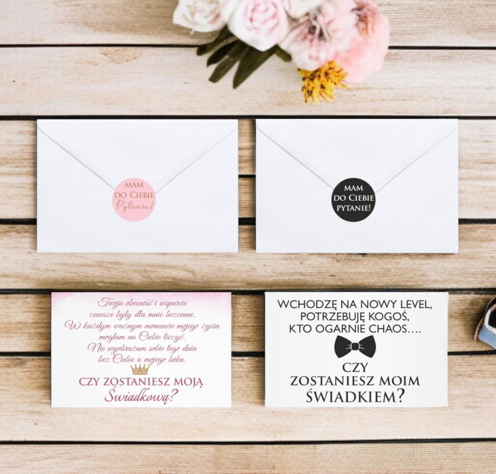 ✅ Biała koperta z różową naklejką, w środku papierowa kartka z prośbą o świadkowanie (bez personalizacji)