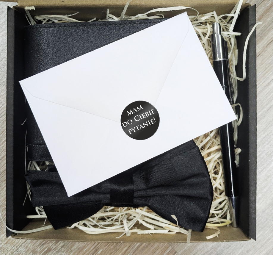 Są pytania, które zasługują na szczególną oprawę. Nasze eleganckie, czarne pudełko z okienkiem to stylowy sposób, by zaprosić kogoś wyjątkowego do roli Świadka w tym wyjątkowym dniu.