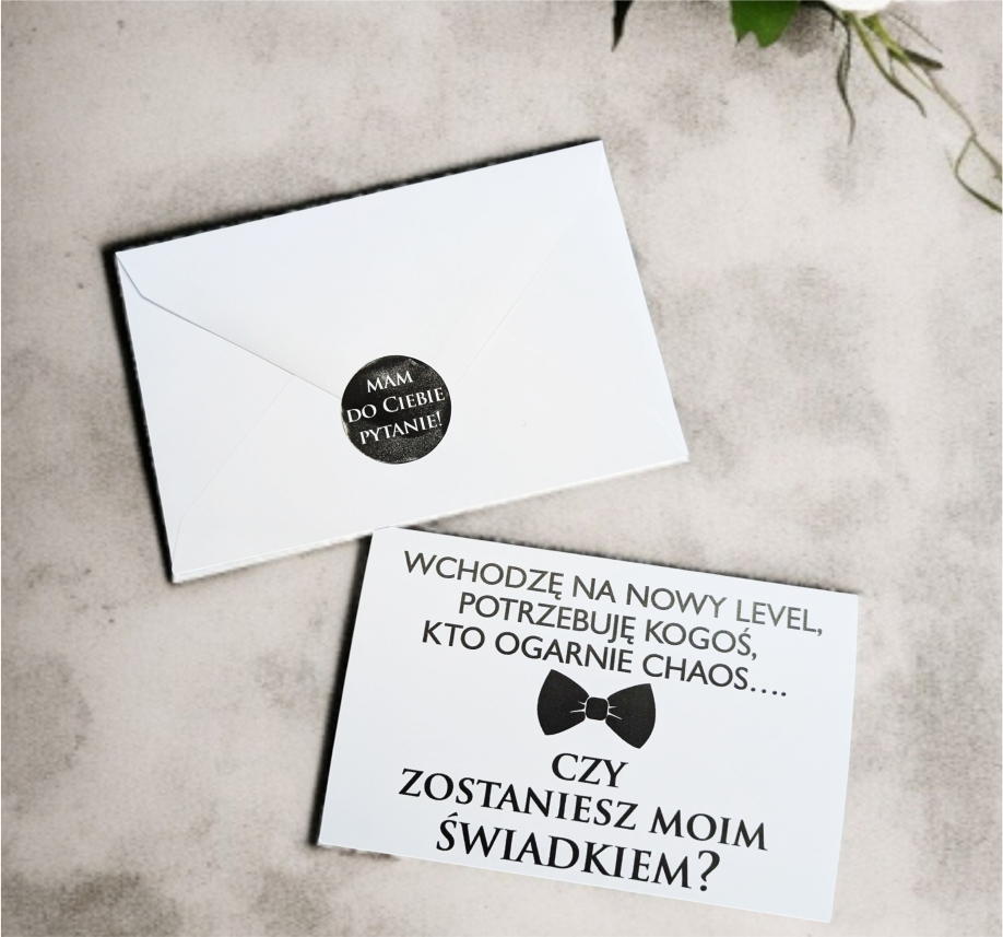 ✅ Biała koperta z różową naklejką, w środku papierowa kartka z prośbą o świadkowanie (bez personalizacji)