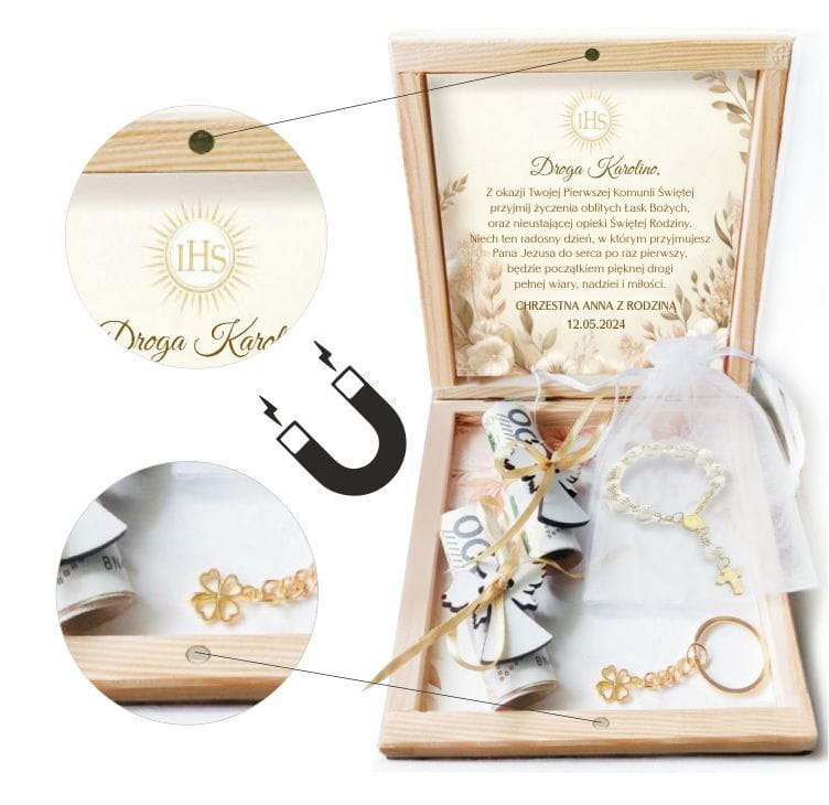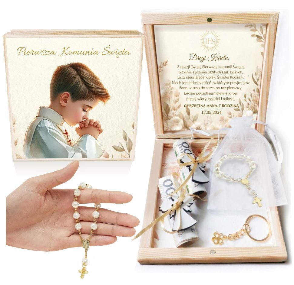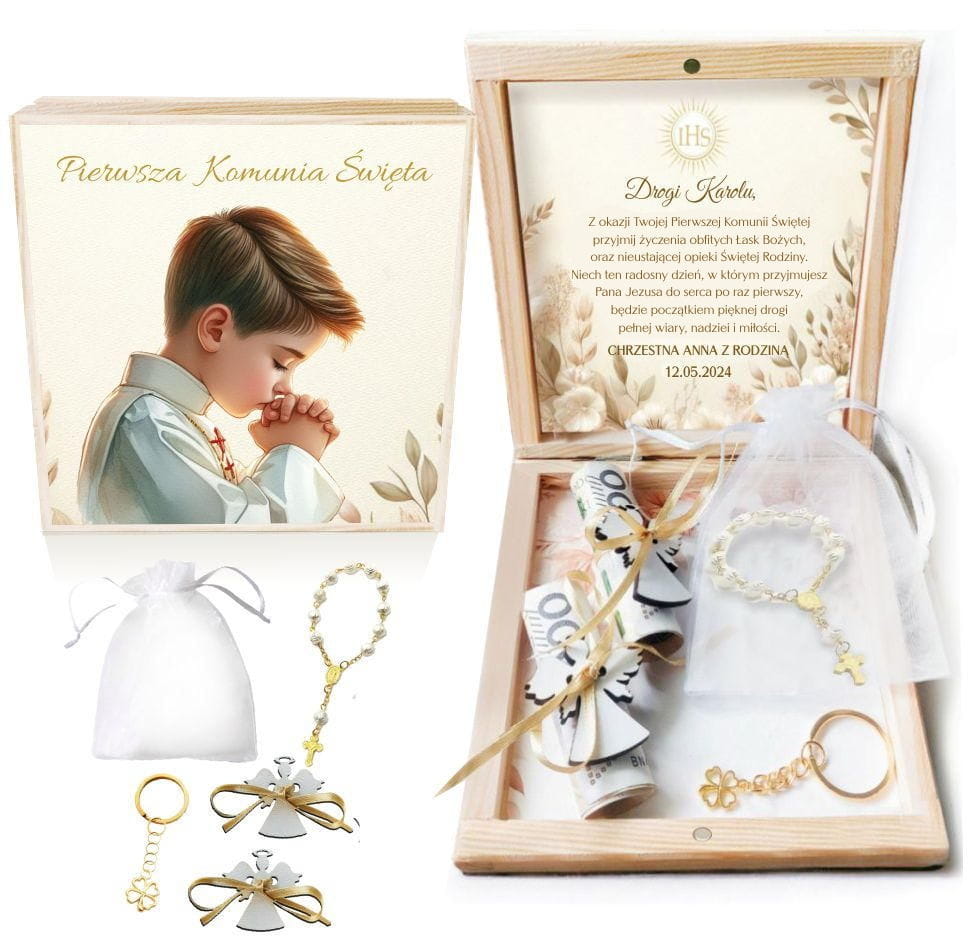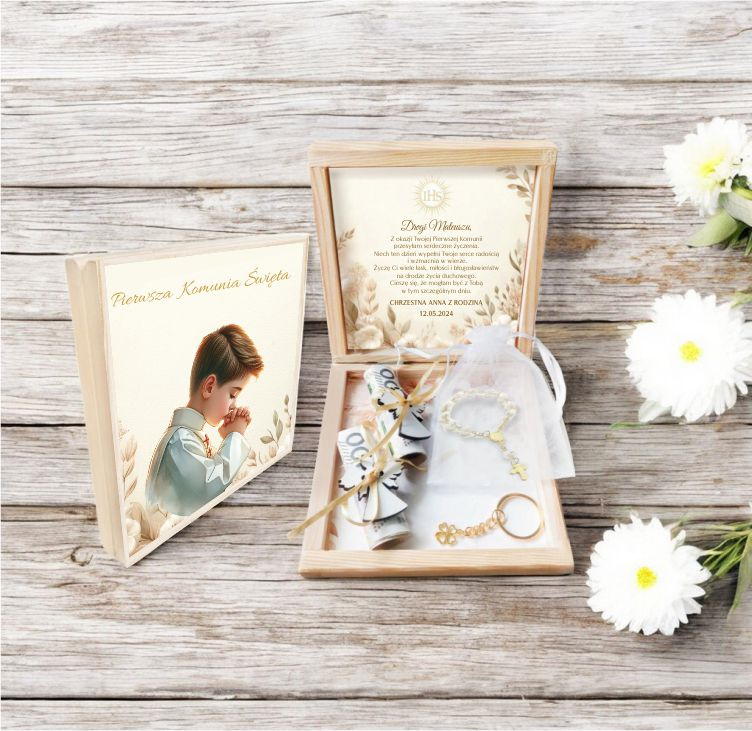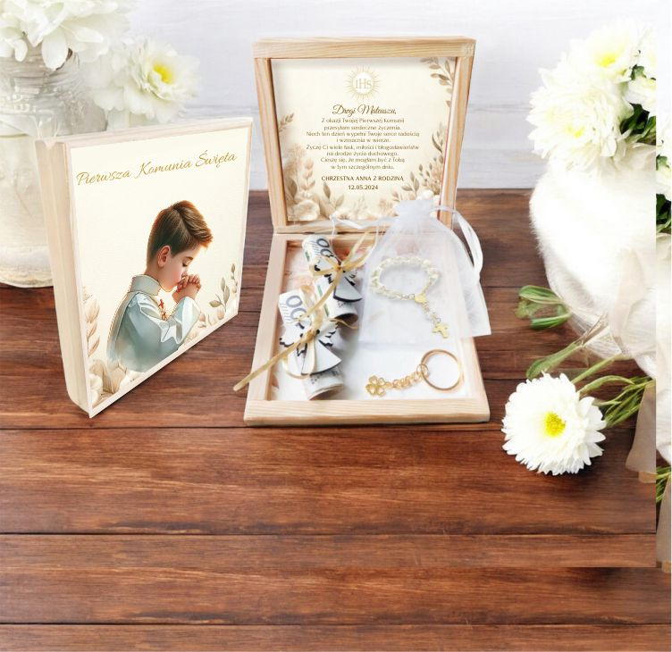 Szukasz wyjątkowego prezentu na Pierwszą Komunię Świętą? Nasze drewniane pudełko będzie strzałem w dziesiątkę! Możesz je spersonalizować imieniem dziecka, datą uroczystości oraz swoim podpisem.