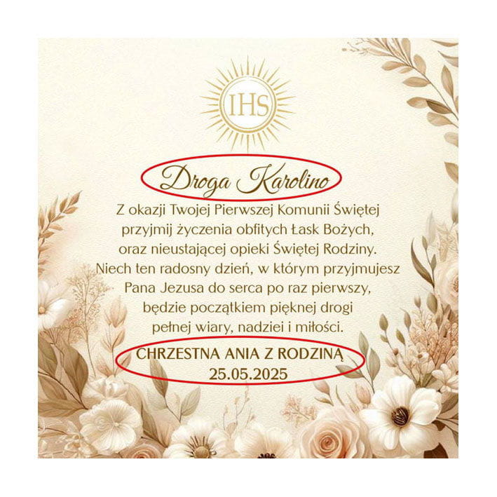 ✅ Na froncie pudełka znajduje się beżowa naklejka z napisem "Pierwsza Komunia Święta".