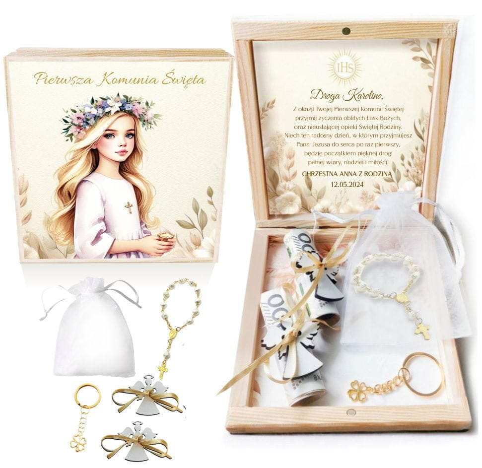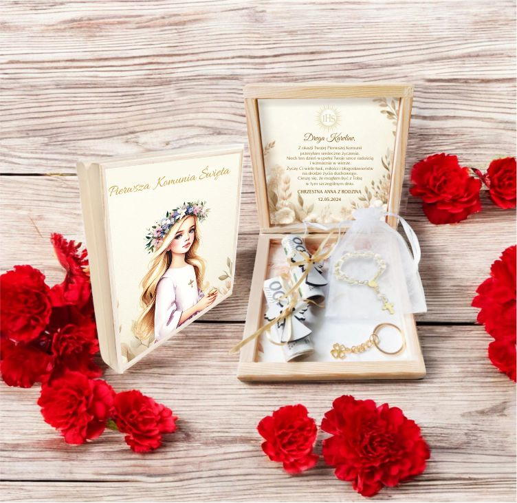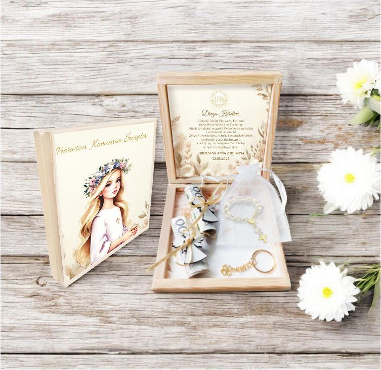 Szukasz wyjątkowego prezentu na Pierwszą Komunię Świętą dla dziewczynki? Nasze drewniane pudełko będzie strzałem w dziesiątkę! Możesz je spersonalizować imieniem dziecka, datą uroczystości oraz swoim podpisem.