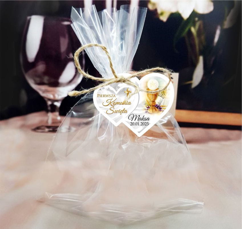 Zawieszka z imieniem i datą uroczystości będzie idealną ozdobą i dodatkiem do prezentu dla gości przybyłych na Komunię. Papierowa zawieszka ma sznurek jutowy do związania prezentu.
