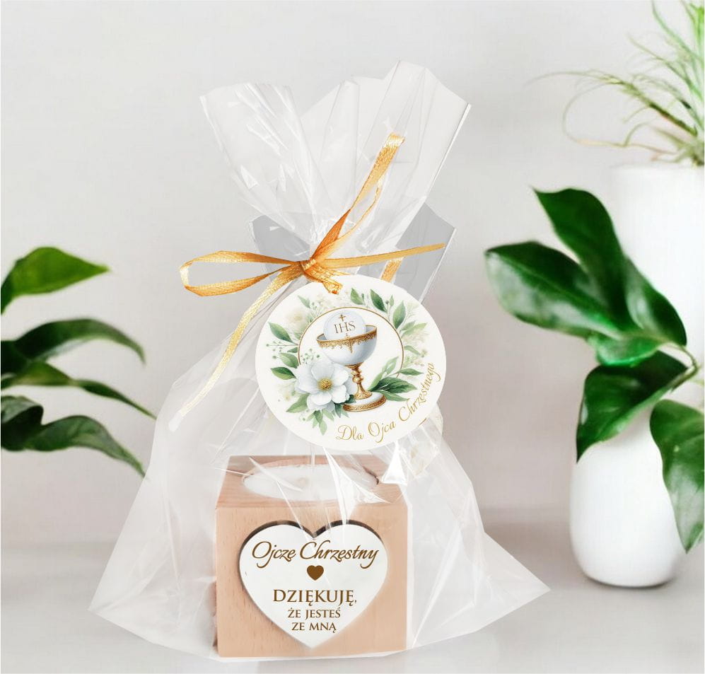 Piękne opakowanie – świecznik zapakowany jest w celofanowy woreczek, ozdobiony złotą wstążką.