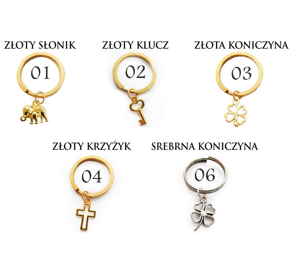 - breloczek z dowolną zawieszką (słonik, klucz, koniczynka, krzyżyk)