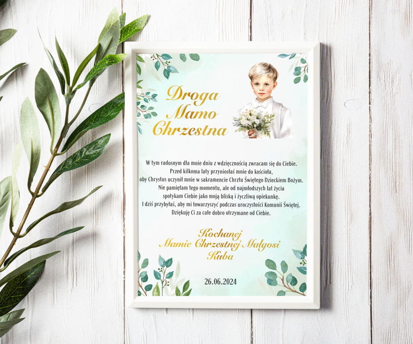 Podziękowanie dla Matki Chrzestnej od chłopca, ramka na I Komunię Świętą .