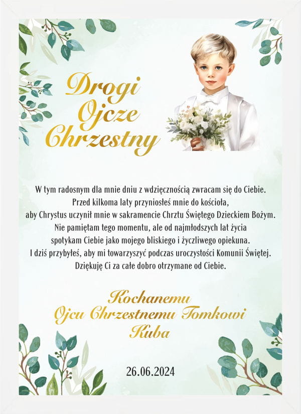 Podziękowanie dla Ojca Chrzestnego Plakat z dedykacją na I Komunię Świętą od chłopca