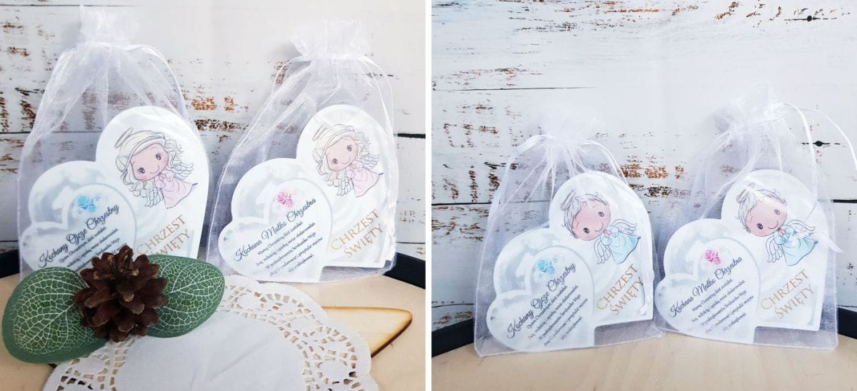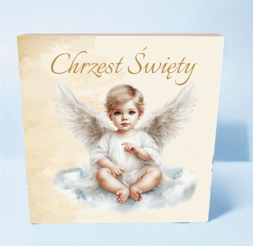 Upominek jest pięknie wykonany i trwały. Front pudełka zdobi biała tabliczka z napisem "Chrzest Święty". W środku znajduje się naklejka z podziękowaniem za przybycie na Chrzest. Dodatkiem jest uroczy magnes na lodówkę oraz eleganckie czekoladki z wyśmienitej belgijskiej białej czekolady.