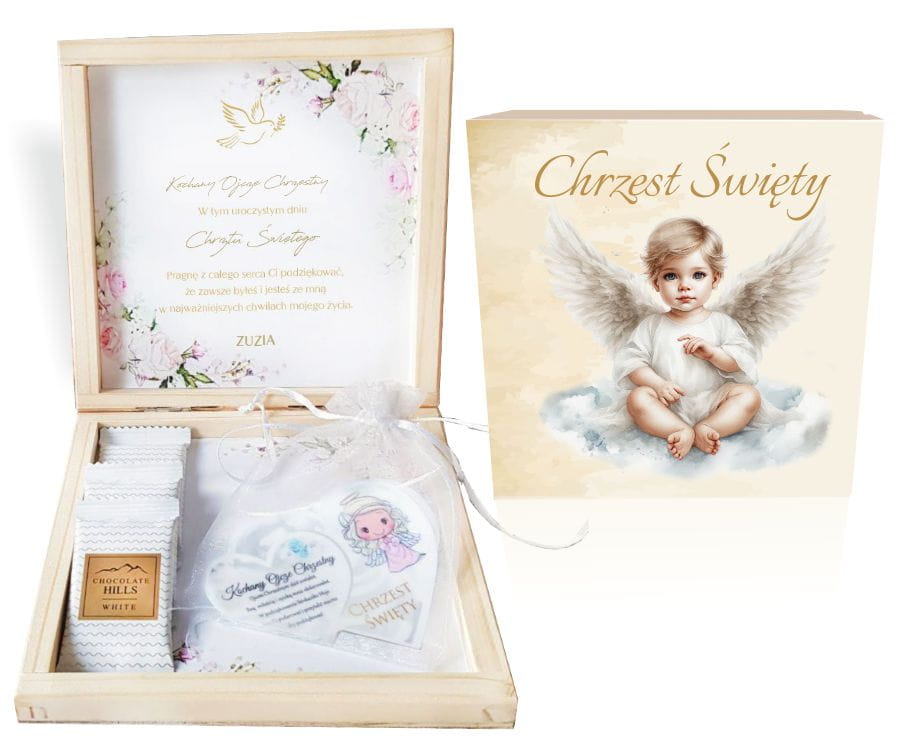 Drewniane pudełko to idealny prezent dla Ojca Chrzestnego w podziękowaniu za obecność na uroczystości Chrztu Świętego.