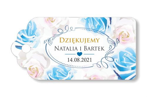 Podziękowanie dla gości, fiolka z solami do kąpieli, bilecik, białe i niebieski róże SOL520