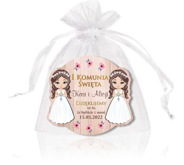 Magnesy komunijne to wyjątkowy upominek i podziękowanie dla przybyłych gości. Oprócz magnesu z imieniem dziecka i datą komunii oferujemy do kompletu biały woreczek z organzy.