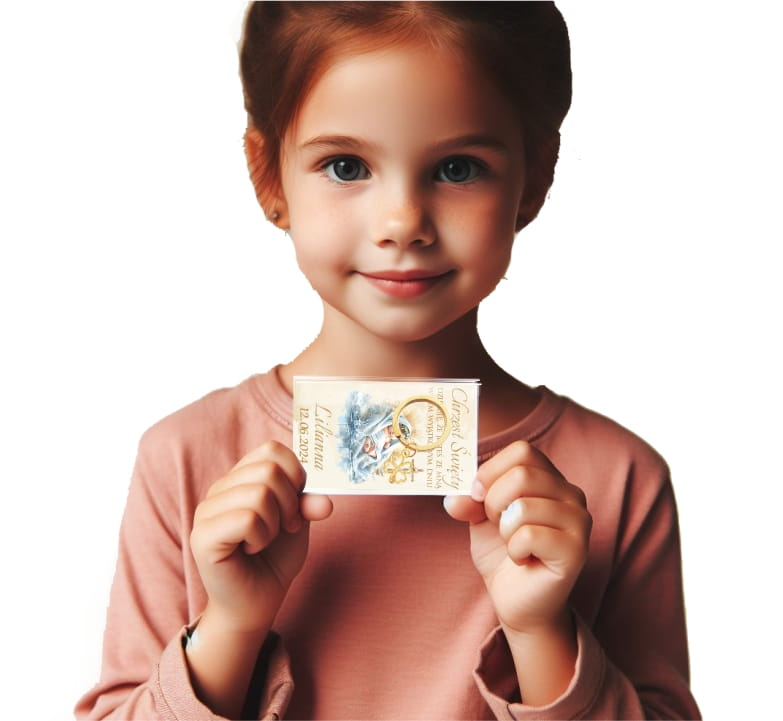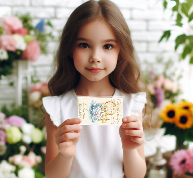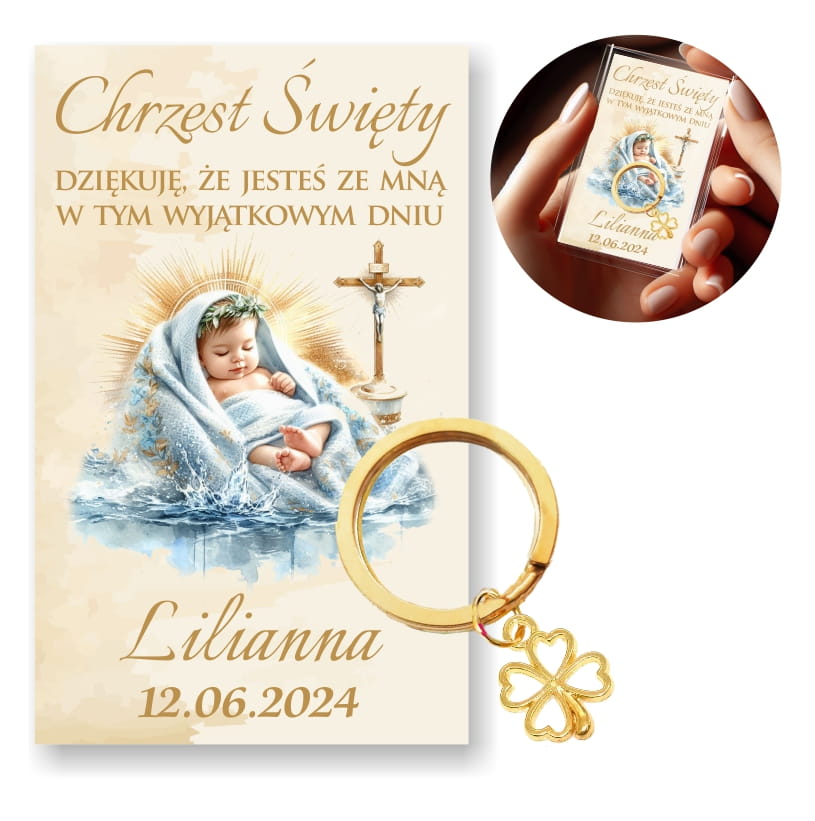 Podziękowanie dla gości na Chrzest, breloczek, kartonik z imieniem dziecka