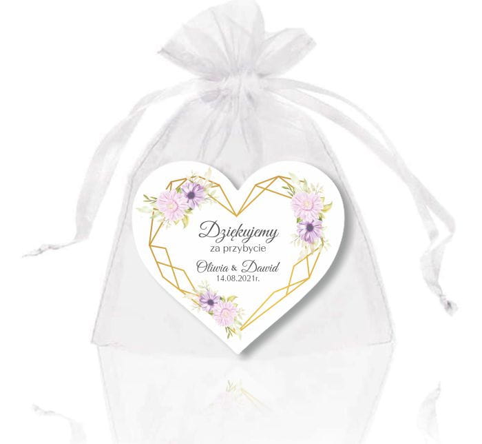 Magnesy w kształcie serca dla gości weselnych, magnes w gerbery i fioletowe kwiaty