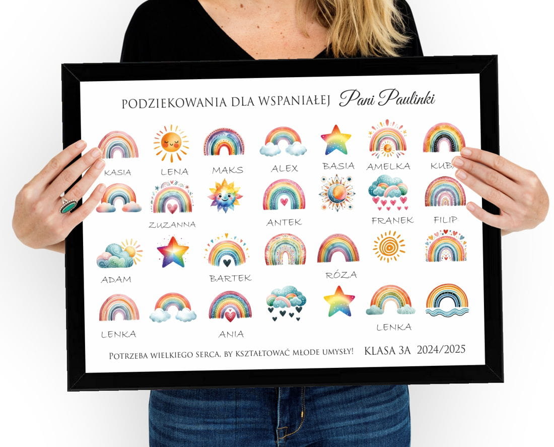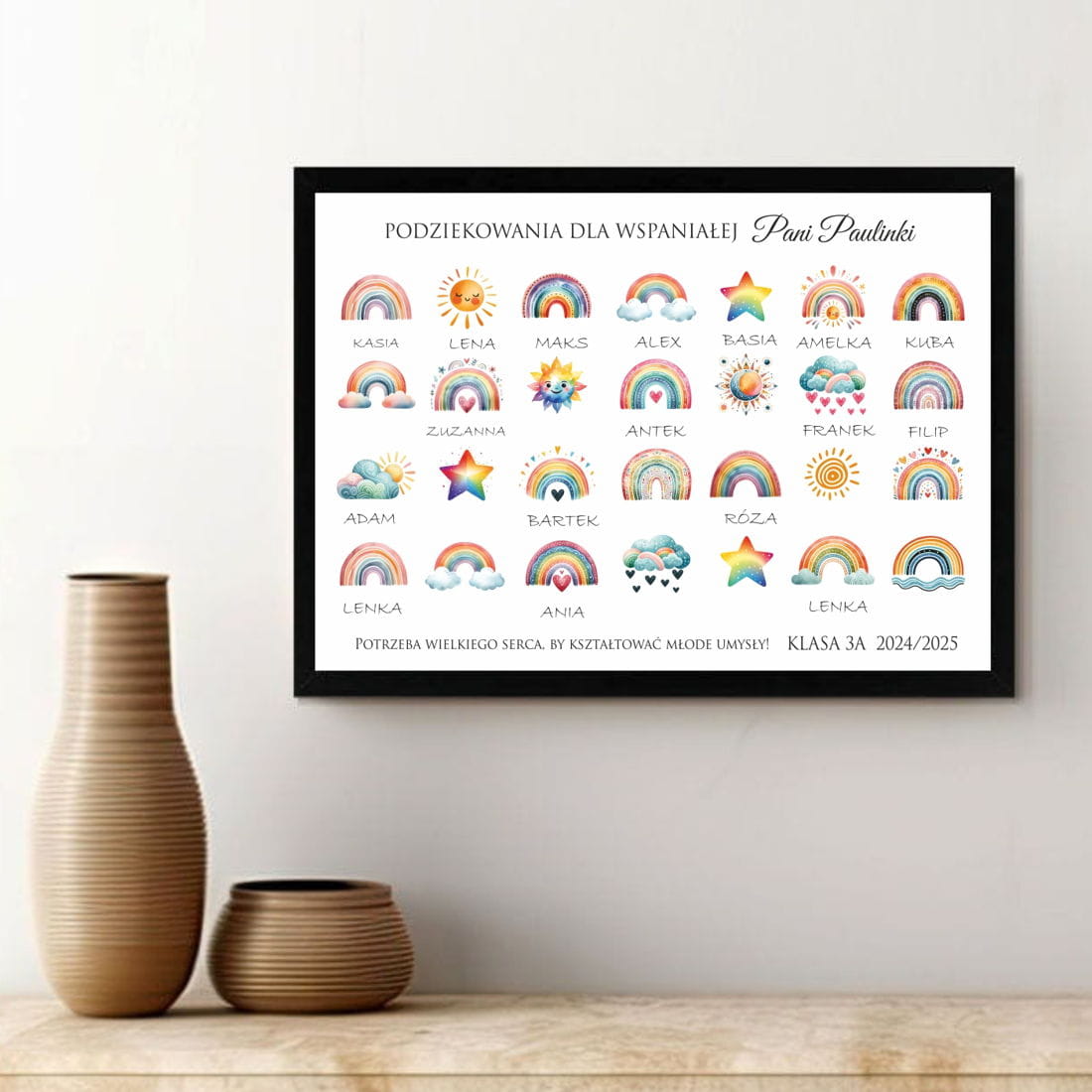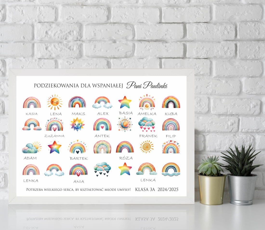 Plakat z imionami uczniów i personalizowaną dedykacją to piękny i symboliczny prezent dla nauczyciela. Pod każdą tęczą jest miejsce na wpisanie imienia dziecka, dzięki czemu całość zyskuje wyjątkowy i osobisty charakter.