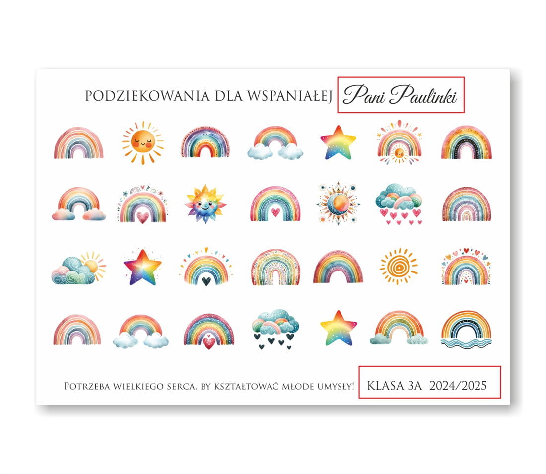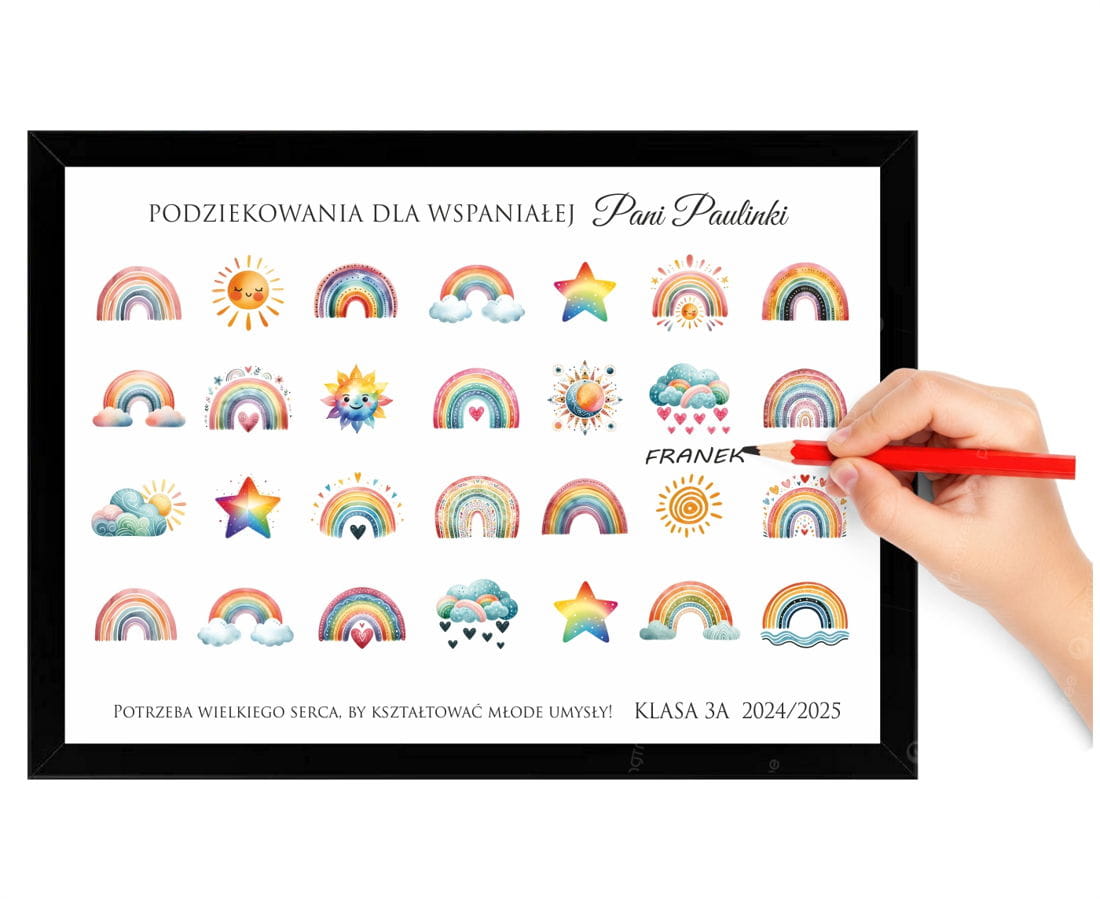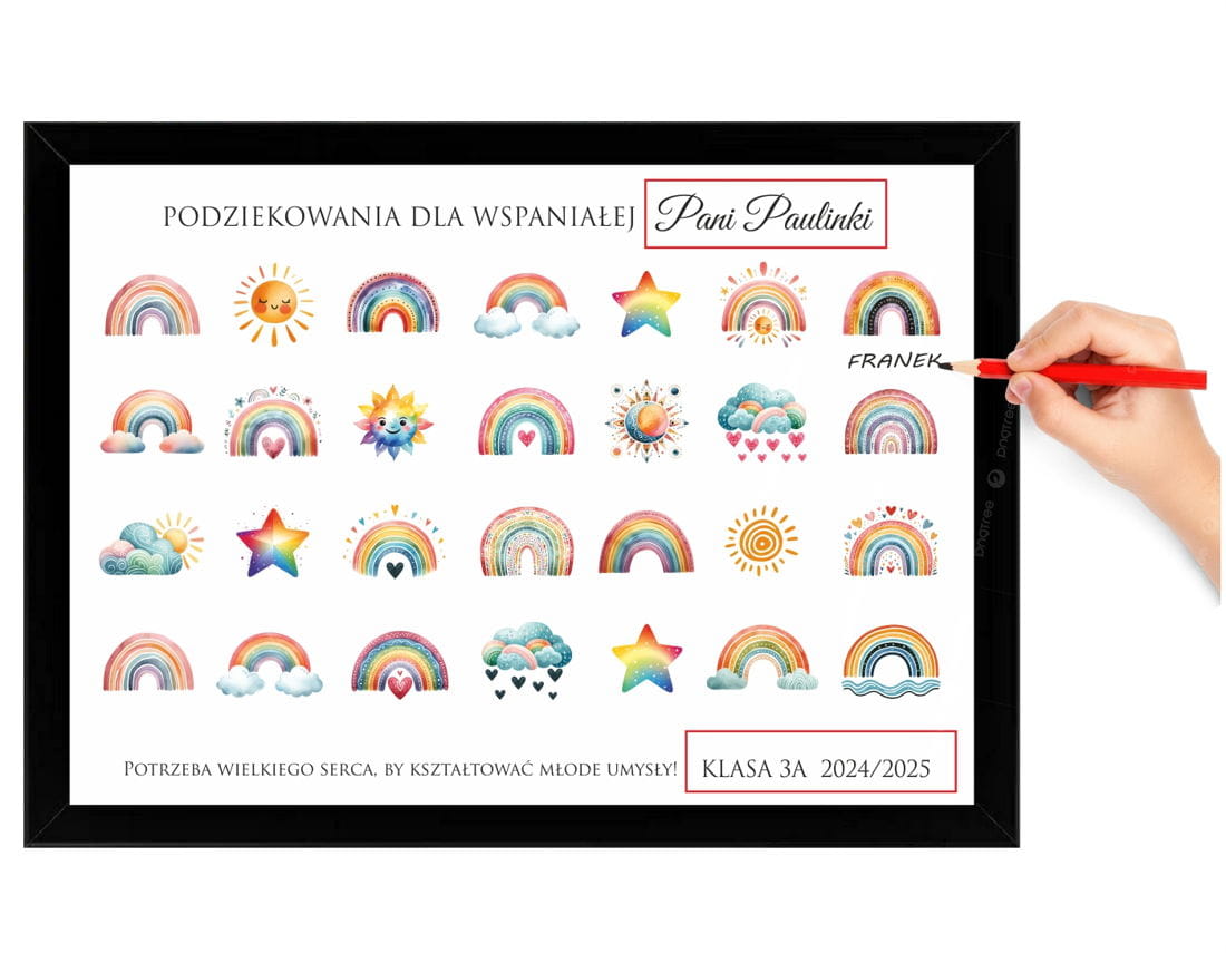 Plakat z imionami uczniów i personalizowaną dedykacją to piękny i symboliczny prezent dla nauczyciela. Pod każdą tęczą jest miejsce na wpisanie imienia dziecka, dzięki czemu całość zyskuje wyjątkowy i osobisty charakter.