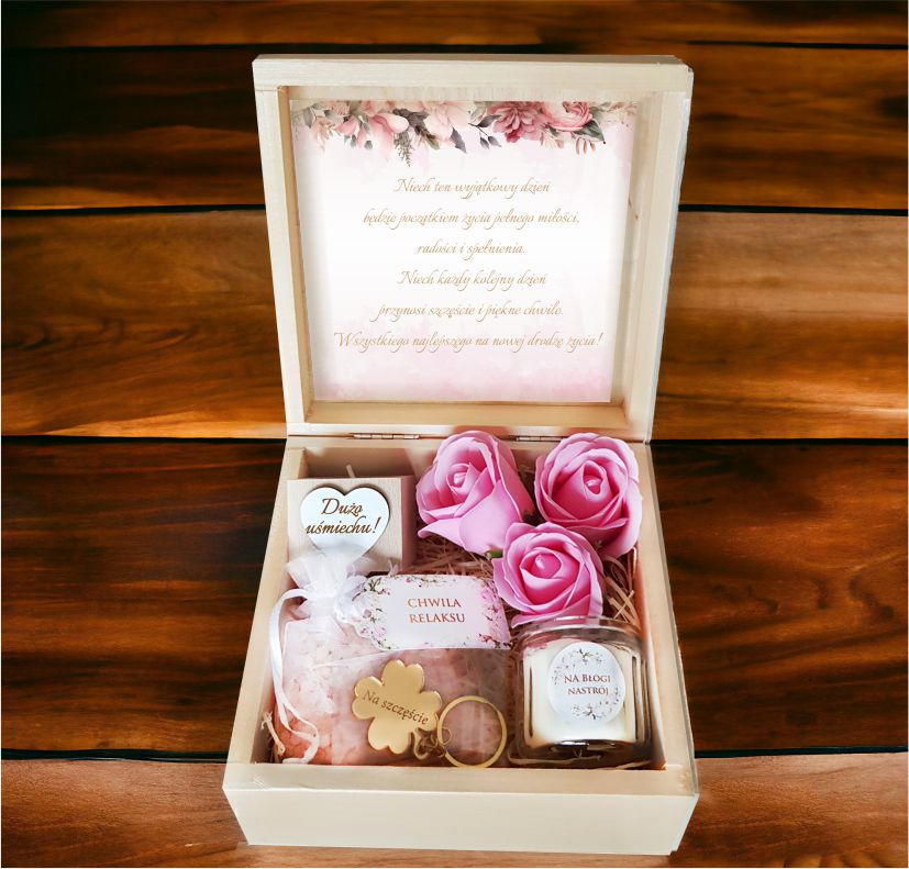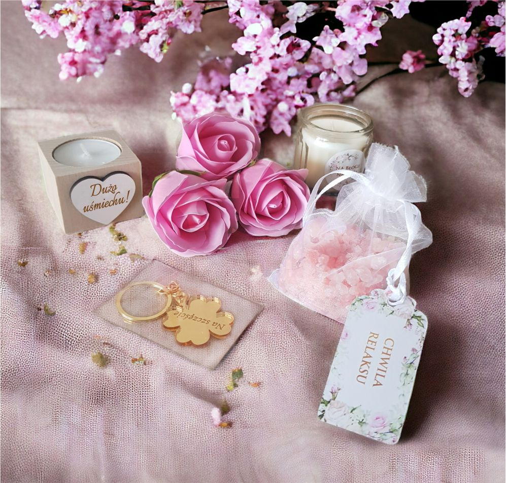 W środku znajdują się między innymi sole do kąpieli i kwiaty mydlane, dzięki którym można urządzić domowe SPA. Poza produktami do relaksacyjnych kąpieli. W pudełku prezentowym znajduje się także zapachowa świeczka w szkle. Błyszczącym dodatkiem będzie złoty, brelok do kluczy - czterolistna koniczyna na szczęście.