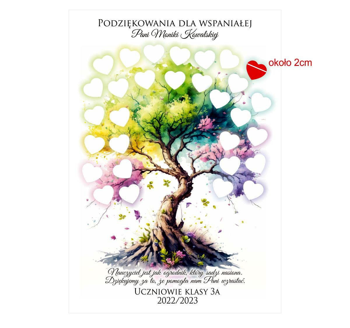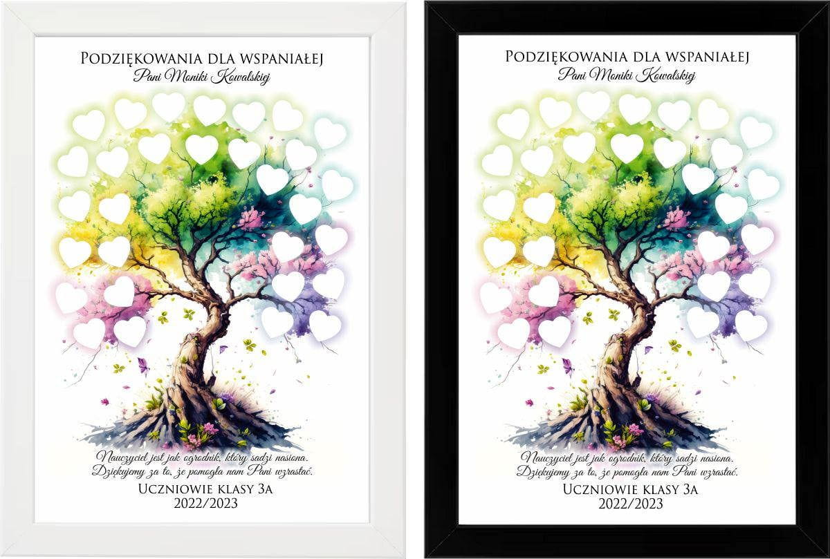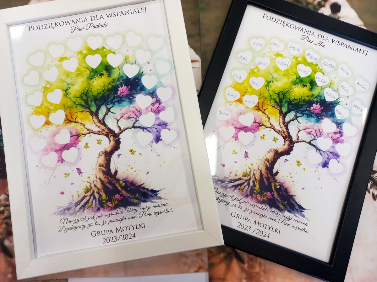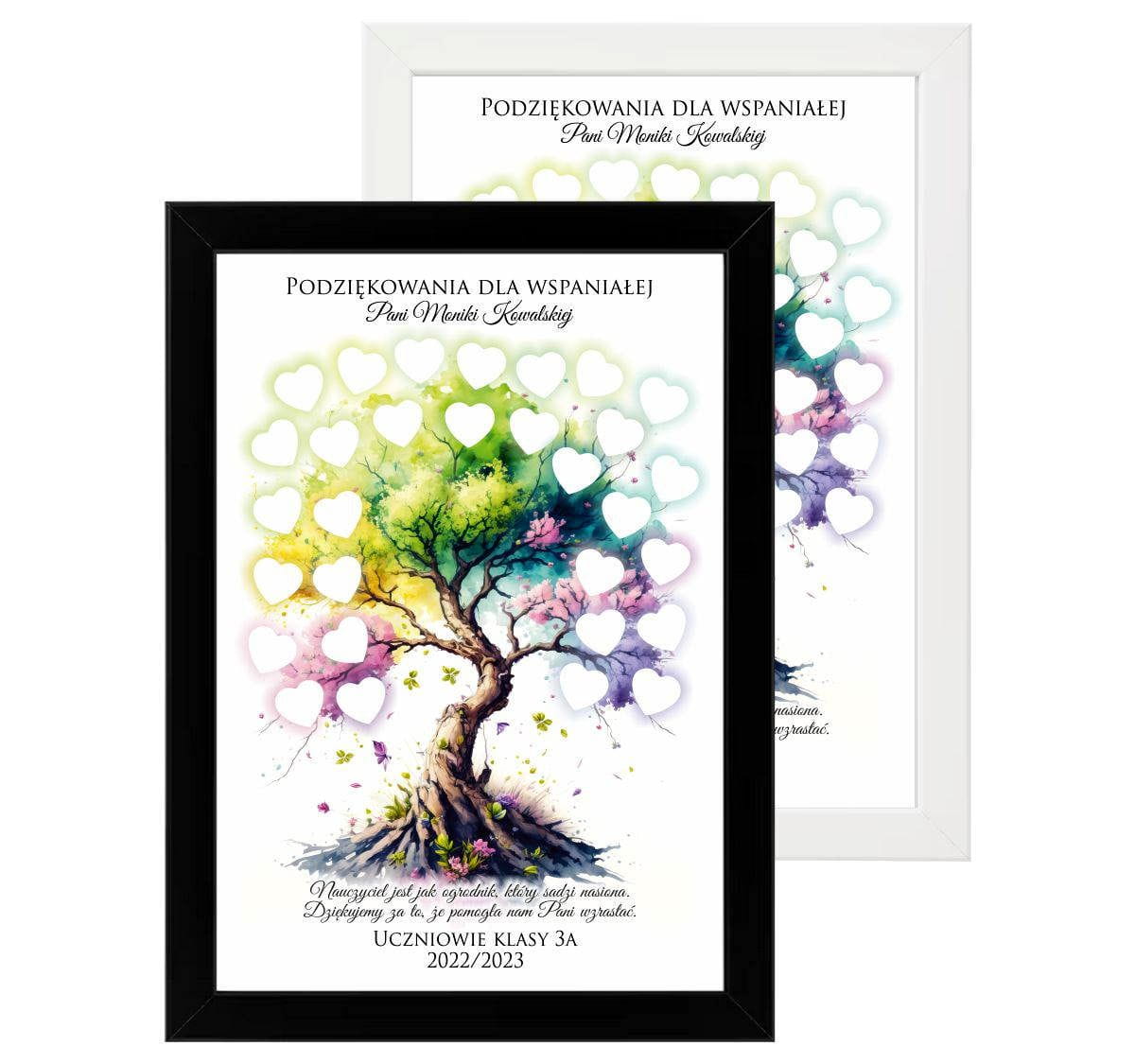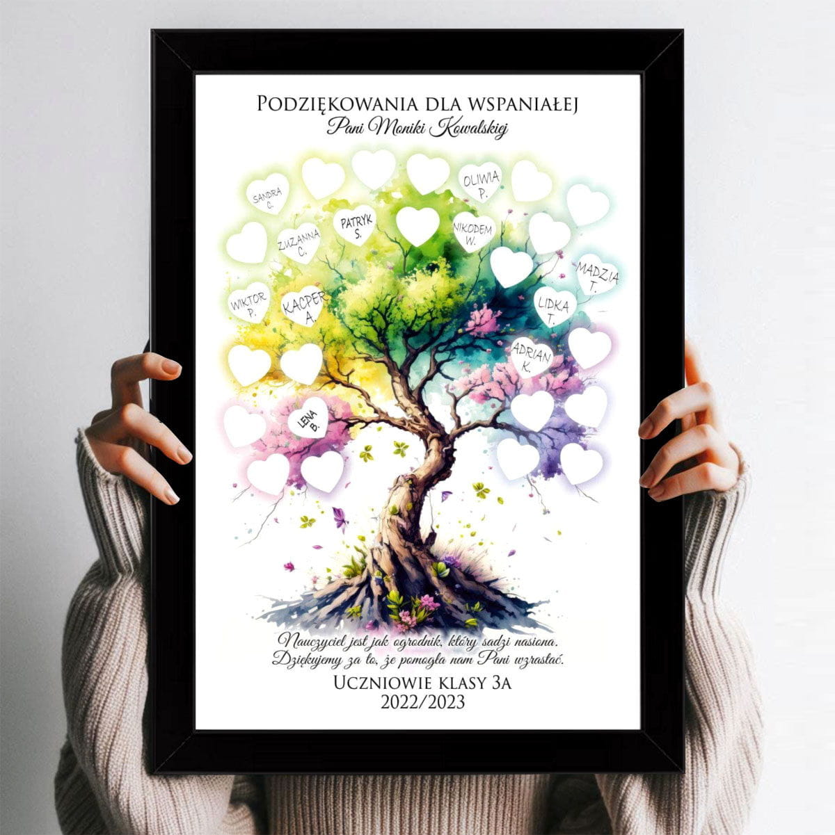 Piękny plakat przedstawiający drzewko z imionami uczniów to świetny prezent aby podziękować swojemu wychowawcy za całe poświęcenie i trud związany z całoroczną nauką. Jeżeli szukacie oryginalnego pomysłu na podziękowanie od całej klasy lub grupy to szczególnie polecamy naszą ramkę z piękną grafiką drzewa i pustymi serduszkami do podpisania się przez uczniów. Taka ramka oprócz walorów dekoracyjnych, będzie także wspaniałą pamiątką na wiele lat.