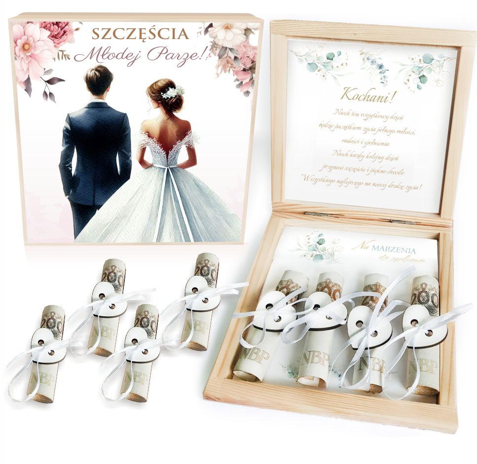 Eleganckie, drewniane pudełko jest idealnym pomysłem na to, jak wręczyć pieniądze w prezencie dla Pary Młodej.
